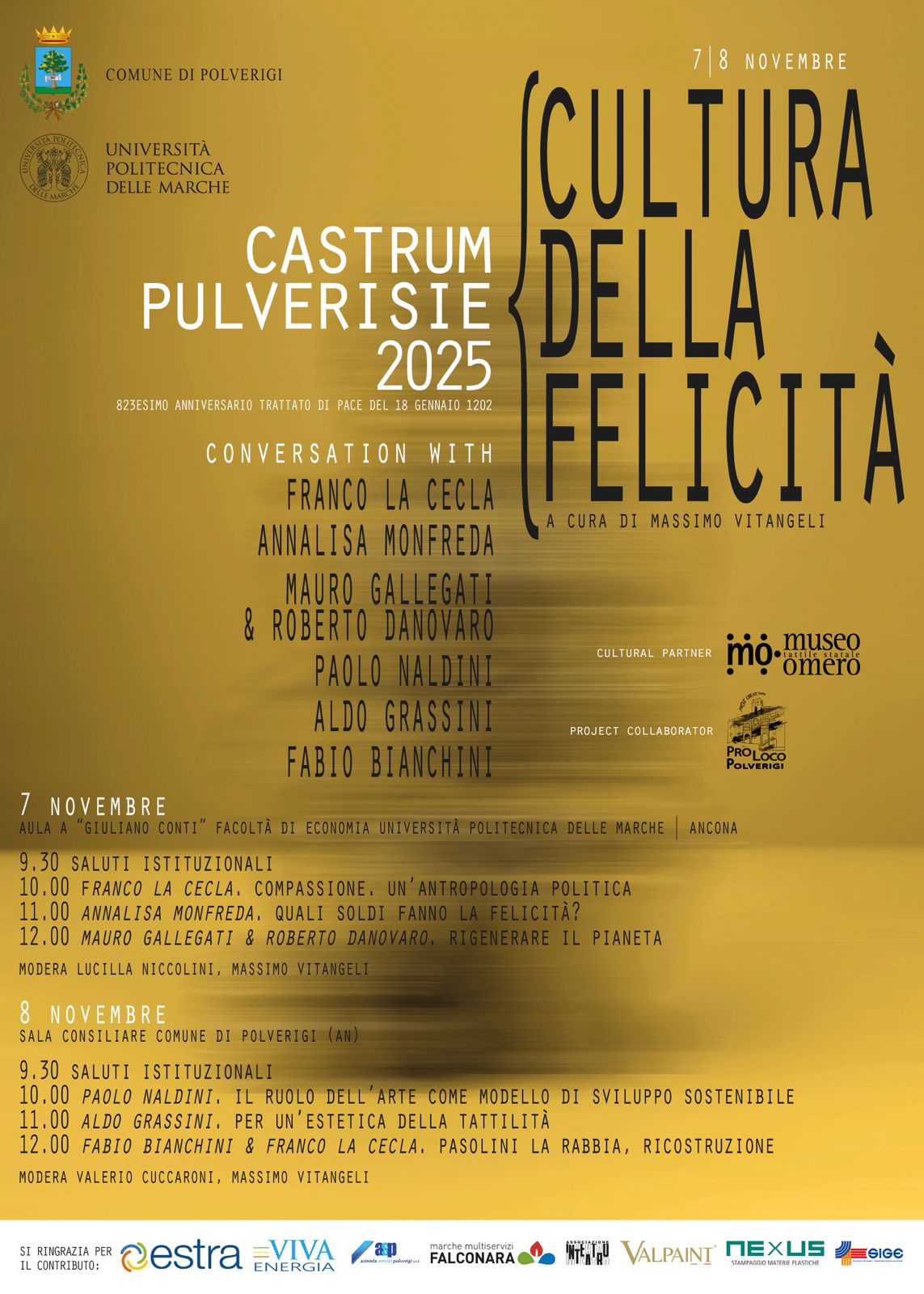 Con la 3° Edizione di Castrum Pulverisie, 823esimo anniversario del Trattato di Pace stipulato il 18 gennaio 1202 a Polverigi, il Comune e l’Università Politecnica delle Marche, con la collaborazione del Museo Tattile Omero di Ancona e la Pro Loco di Polverigi, avviano un progetto di respiro biennale che propone una singolare riflessione sull’idea di Felicità, condizione da noi tutti auspicata.