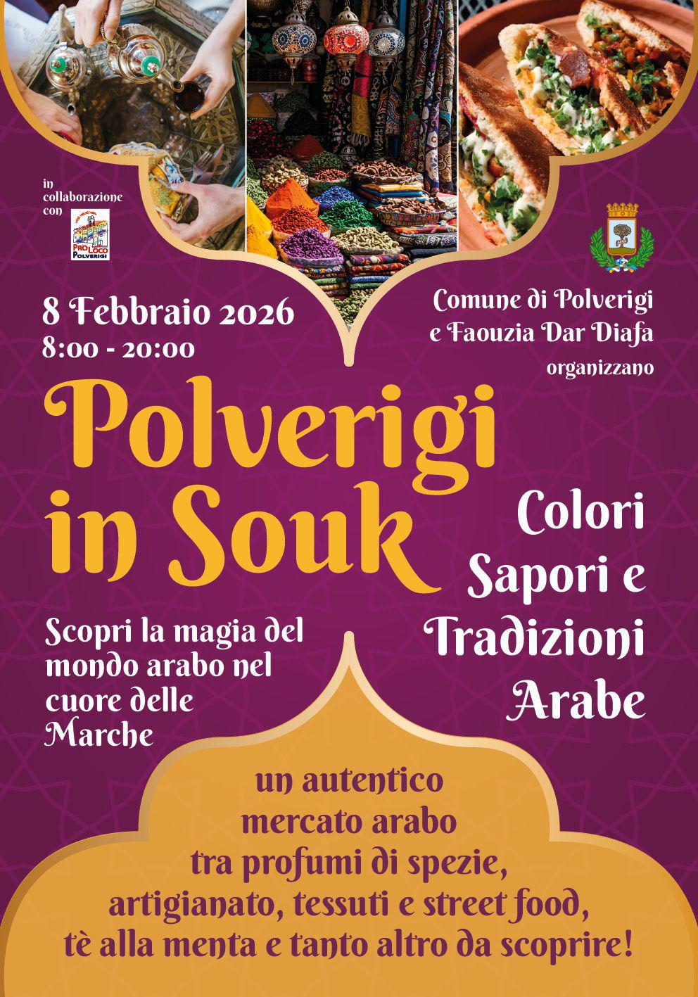 Domenica 8 febbraio 2026, dalle 8:00 alle 20:00, il Centro Storico di Polverigi ospita Polverigi in Souk, un evento dedicato alla scoperta del mondo arabo.