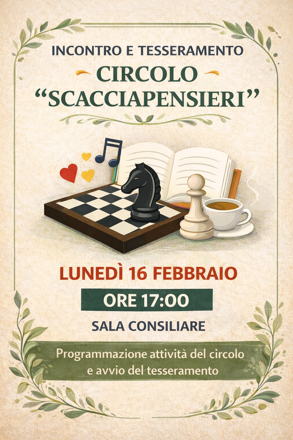 Si informa la cittadinanza che lunedì 16 febbraio alle ore 17:00, presso la Sala Consiliare, si terrà un incontro dedicato alla definizione delle attività del Circolo Scacciapensieri e all’avvio del tesseramento.